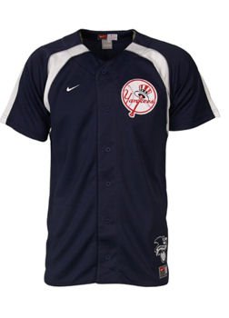 This youth New York Yankees baseball jersey by Nike features full button front, just like the real jerseys. Jersey is team color mesh and has has logo embroidery patch left chest and contrasting shoulder stripes. 100% polyester.
